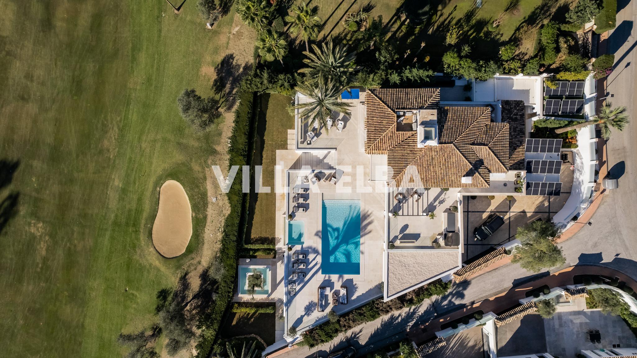 The main floor presents an open-plan living and dining area with restored wooden ceilings, large windows and direct access to generous terraces with a heated pool, Jacuzzi and panoramic views over the golf valley. A fully fitted kitchen, three bedrooms, a TV room and a laundry room complete this level.